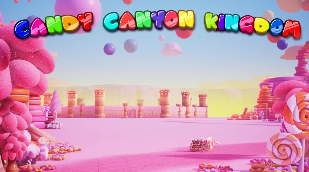 Reino Cañón Caramelo consta de una paleta de colores pastel. Los accidentes geográficos y las nubes del reino son de color rosa claro, mientras que el cielo contiene un degradado de azul a amarillo. Ubicado en el medio del cañón hay un castillo de color marrón claro, y el reino en general está ubicado en un desierto de color rosa suave. Alrededor del castillo de dulces hay un pequeño pueblo que también parece estar hecho de dulces con un gran muro construido alrededor de la capital para mantenerla a salvo de los invasores. El desierto rosado que lo rodea también tiene varios dulces gigantes esparcidos que parecen formaciones rocosas gigantes.